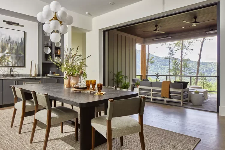 Through the living room, the kitchen feeds into the dining area, which opens through sliding glass doors to a spacious porch overlooking the mountain. Whether you’re savoring a quiet moment over a cup of coffee or catching up with friends around the fire-pit, the porch is designed for both reflection and connection.
